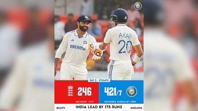 At Stumps on Day 2, India's score read 421/7, with Ravindra Jadeja (81) and Axar Patel (35) standing unbeaten at the crease.