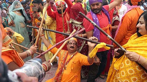 After the Laddoo Maar Holi in Barsana, the celebrations shift to the Lathmar Holi, where men from neighbouring towns, especially Mathura, visit Barsana to participate in this unique celebration. The women of Barsana playfully hit them with sticks.