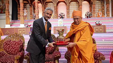 Dr Jaishankar was traditionally welcomed by senior swamis and trustees of BAPS Swaminarayan Sanstha (BAPS). Dr Jaishankar and his wife then proceeded on a brief tour of the Mandir, spending several minutes absorbing its peace and intricate architecture while also learning about the contributions of the Mandir and wider fellowship to British society.