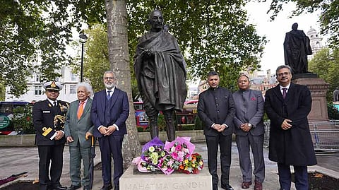 At Parliament Square, where the Gandhi statue was unveiled in 2015, students and members of the Indian diaspora gathered for floral tributes led by British Indian economist and peer Lord Meghnad Desai – who had led the charity drive for the creation of this new memorial in the UK capital to the apostle of peace known as Bapu.